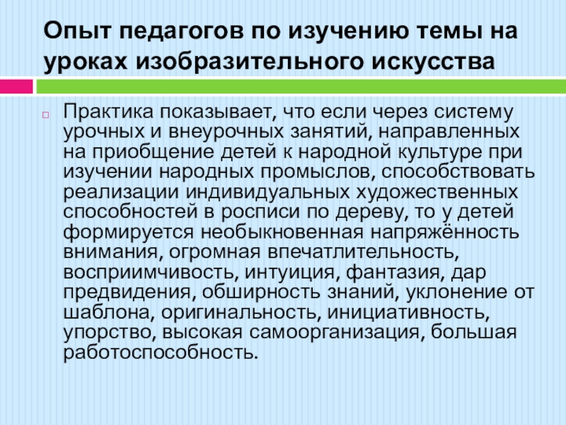 если через систему урочных и внеурочных занятий, направленных на приобщение детей к народной культуре при изучении народных промыслов, способствовать реализации индивидуальных художественных способностей в росписи по дереву, то у детей формируется необыкновенная напряжённость внимания, огромная впечатлительность, восприимчивость, интуиция, фантазия, дар предвидения, обширность знаний, уклонение от шаблона, оригинальность, инициативность, упорство, высокая самоорганизация, большая работоспособность.