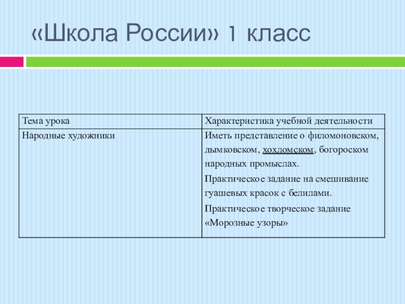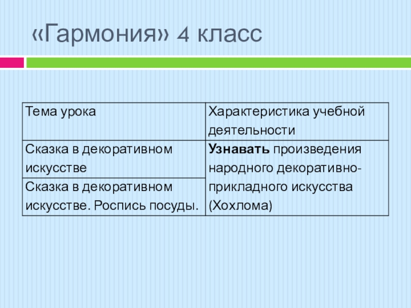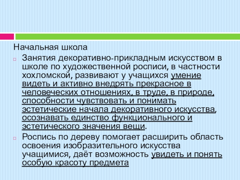 хохломской, развивают у учащихся умение видеть и активно внедрять прекрасное в человеческих отношениях, в труде, в природе, способности чувствовать и понимать эстетические начала декоративного искусства, осознавать единство функционального и эстетического значения вещи.