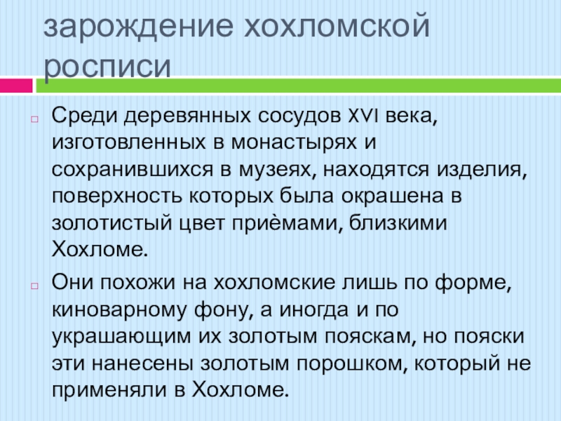 сохранившихся в музеях, находятся изделия, поверхность которых была окрашена в золотистый цвет приѐмами, близкими Хохломе.