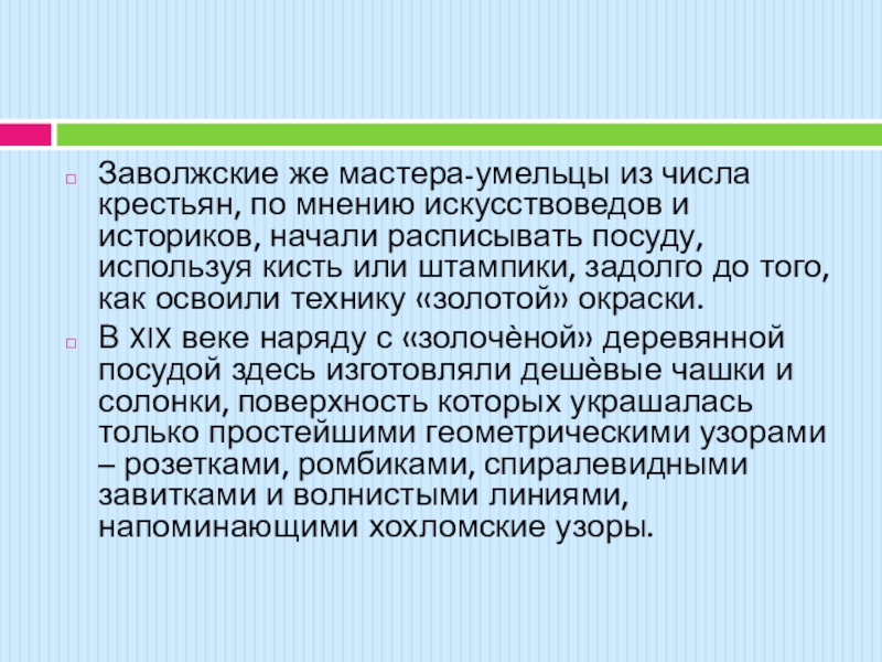 Слайд 5Заволжские же мастера-умельцы из числа крестьян, по мнению искусствоведов и историков,