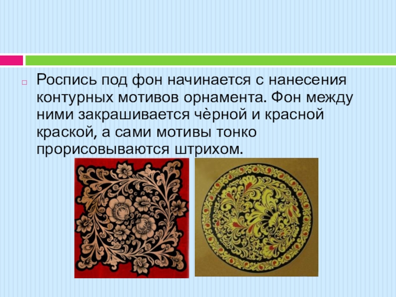Слайд 13Роспись под фон начинается с нанесения контурных мотивов орнамента. Фон между