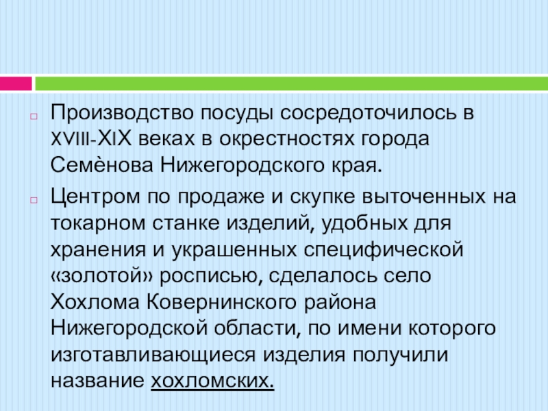 Слайд 8Производство посуды сосредоточилось в XVIII-ХIХ веках в окрестностях города Семѐнова Нижегородского