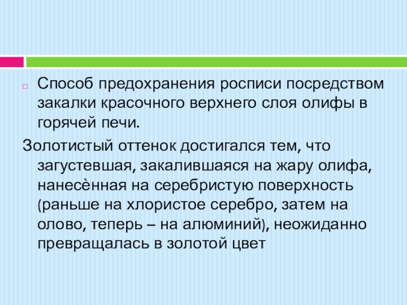 Слайд 7Способ предохранения росписи посредством закалки красочного верхнего слоя олифы в горячей