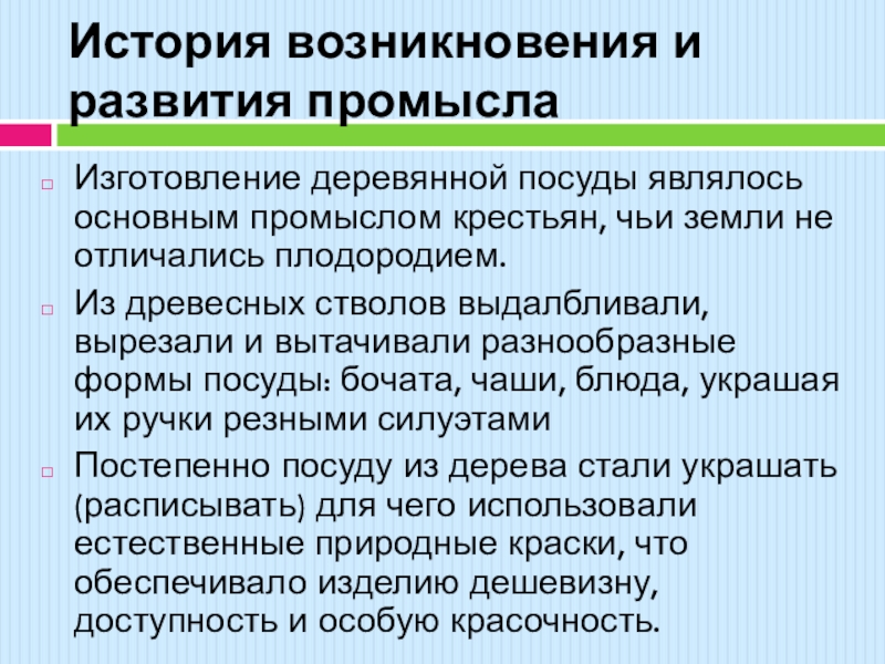Постепенно посуду из дерева стали украшать (расписывать) для чего использовали естественные природные краски, что обеспечивало изделию дешевизну, доступность и особую красочность.