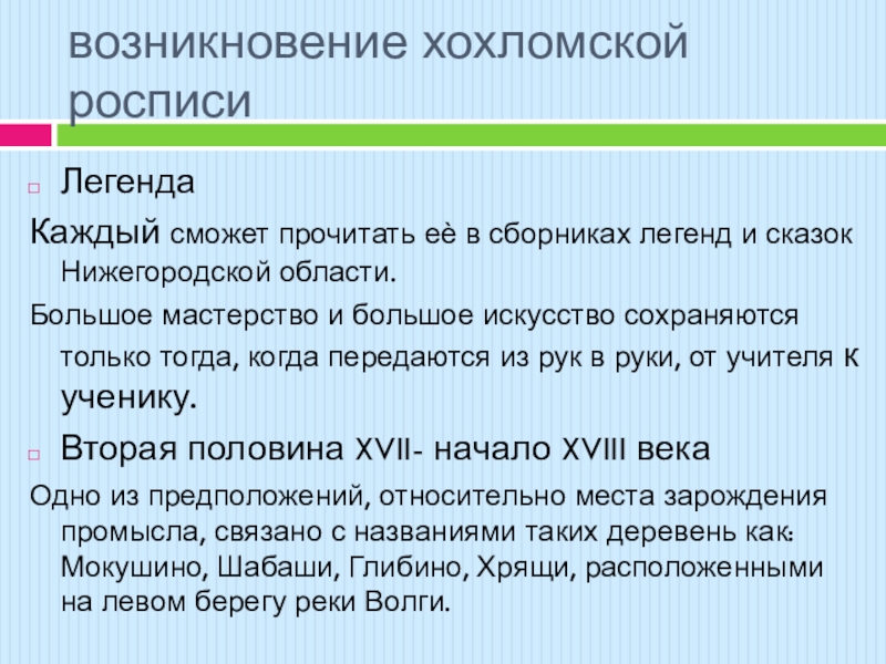 Одно из предположений, относительно места зарождения промысла, связано с названиями таких деревень как: Мокушино, Шабаши, Глибино, Хрящи, расположенными на левом берегу реки Волги.