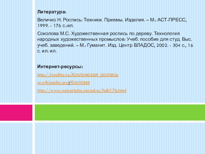 Соколова М.С. Художественная роспись по дереву. Технология народных художественных промыслов: Учеб. пособие для студ. Выс. учеб. заведений. – М.: Гуманит. Изд. Центр ВЛАДОС, 2002. - 304 с., 16 с. ил: ил.