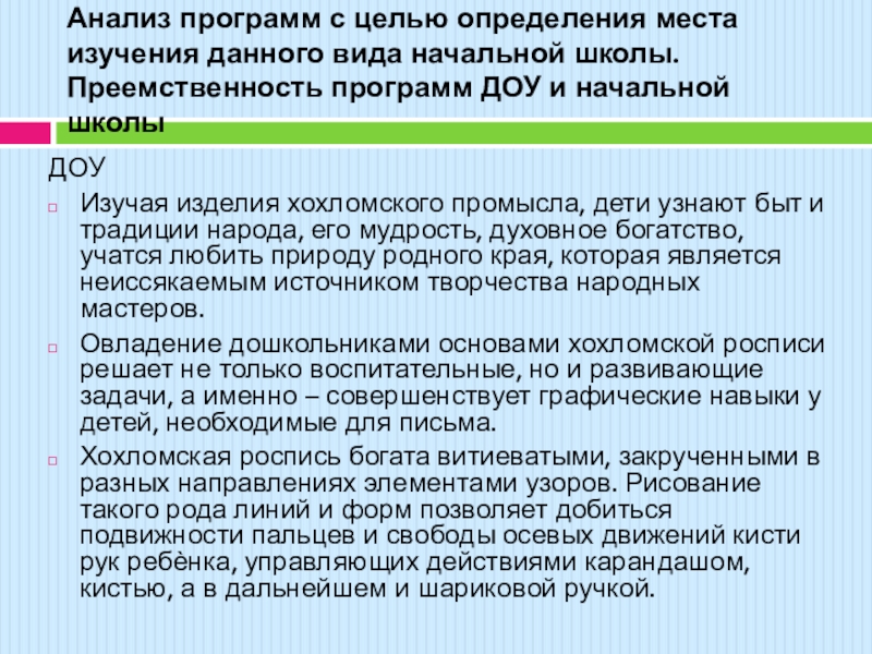 Овладение дошкольниками основами хохломской росписи решает не только воспитательные, но и развивающие задачи, а именно – совершенствует графические навыки у детей, необходимые для письма.