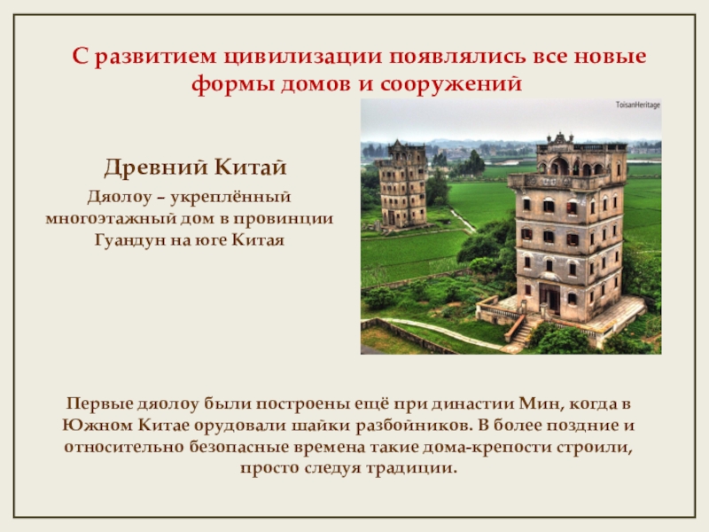 Первые дяолоу были построены ещё при династии Мин, когда в Южном Китае орудовали шайки разбойников. В более поздние и относительно безопасные времена такие дома-крепости строили, просто следуя традиции.