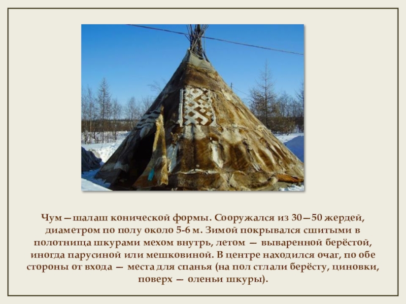 Каркас из лёгких деревянных шестов покрывают оленьими или моржовыми шкурами (в среднем около 50 шкур).
