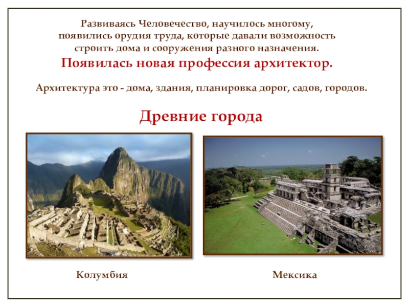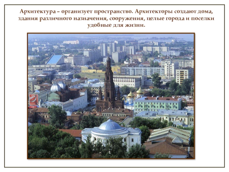Архитектура это - дома, здания, планировка дорог, садов, городов.
