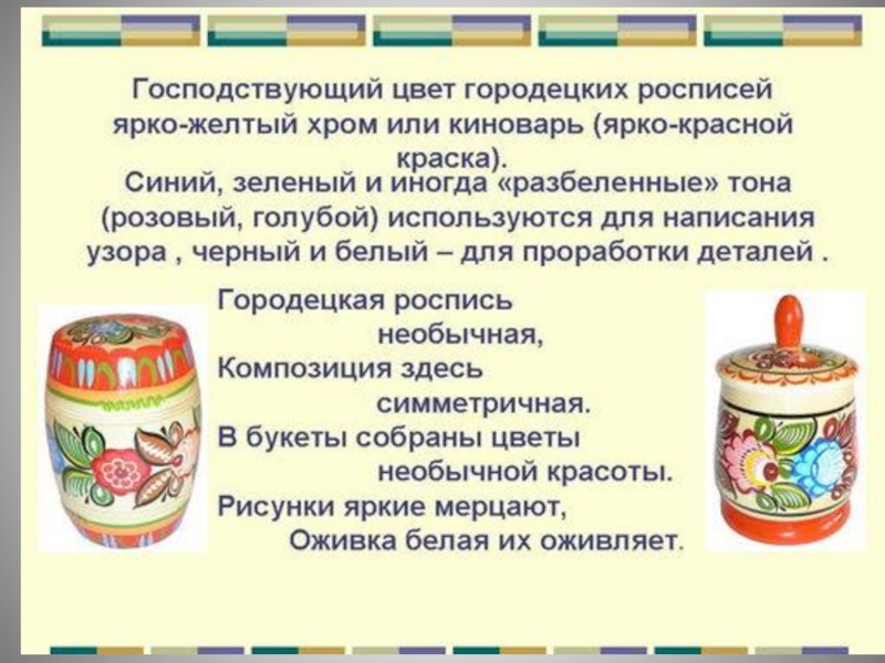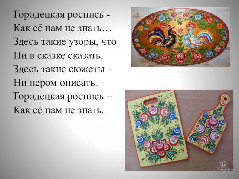 Городецкая роспись -Как её нам не знать…Здесь такие узоры, что Ни в сказке сказать.Здесь такие сюжеты -Ни пером описать.Городецкая роспись –Как её нам не знать.
