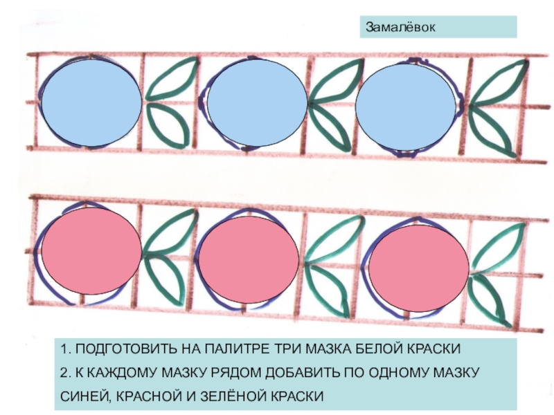 Замалёвок1. ПОДГОТОВИТЬ НА ПАЛИТРЕ ТРИ МАЗКА БЕЛОЙ КРАСКИ2. К КАЖДОМУ МАЗКУ РЯДОМ ДОБАВИТЬ ПО ОДНОМУ МАЗКУСИНЕЙ, КРАСНОЙ