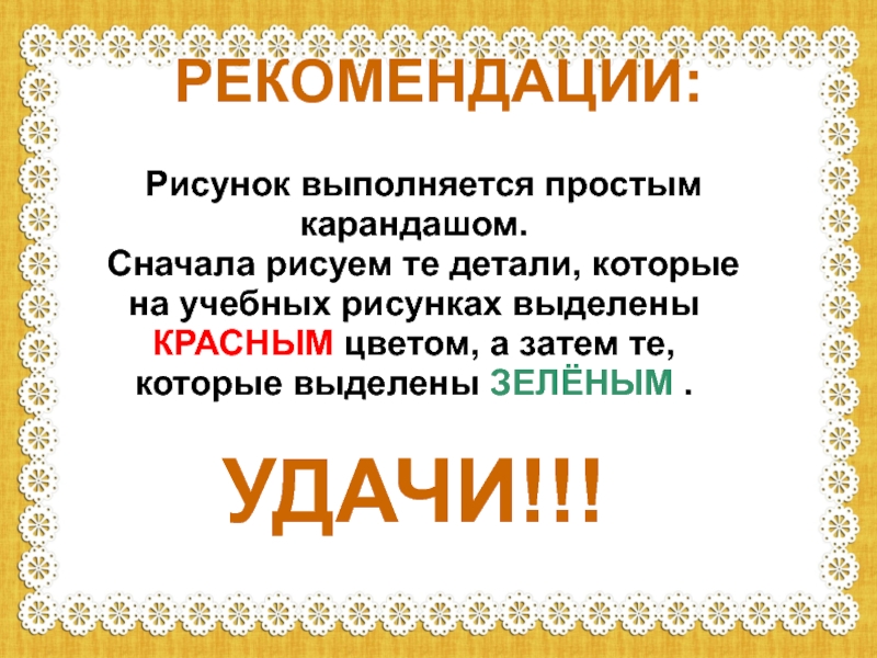 РЕКОМЕНДАЦИИ: Рисунок выполняется простым карандашом. Сначала рисуем те детали, которые на учебных рисунках выделены КРАСНЫМ цветом, а затем те, которые выделены ЗЕЛЁНЫМ .УДАЧИ!!!