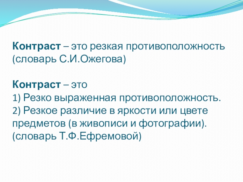 Слайд 6Контраст – это резкая противоположность (словарь С.И.Ожегова) Контраст – это 1) Резко