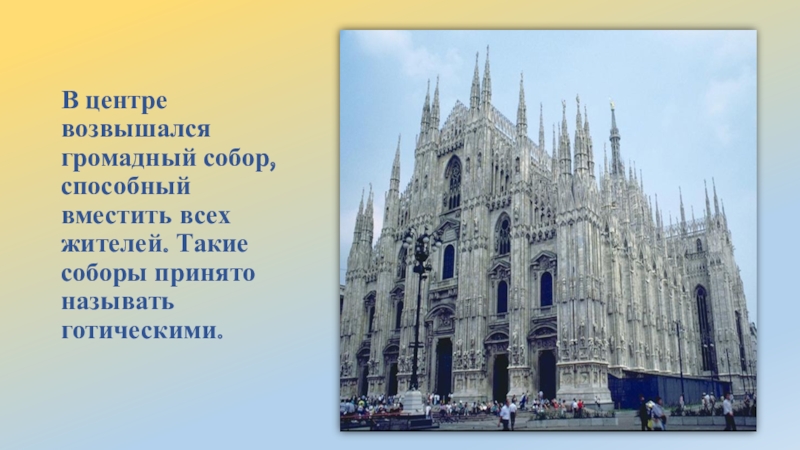 В центре возвышался громадный собор, способный вместить всех жителей. Такие соборы принято называть готическими.