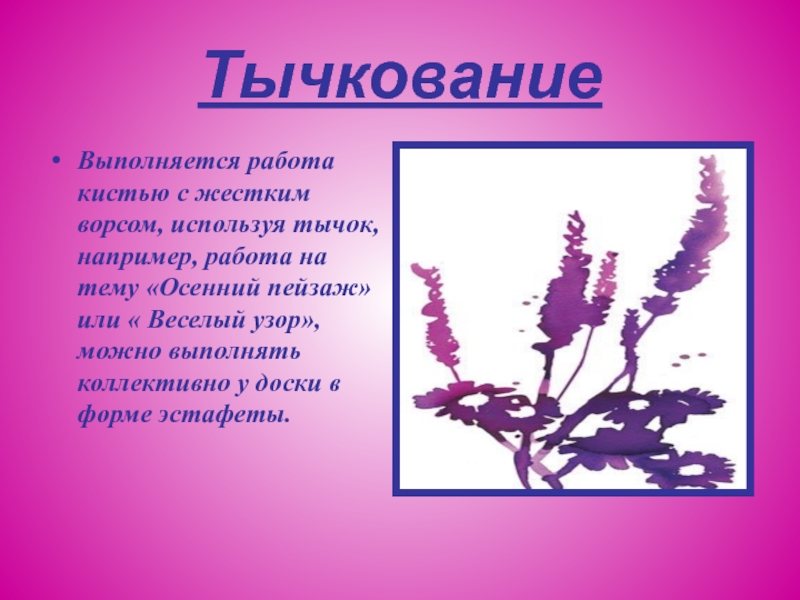 ТычкованиеВыполняется работа кистью с жестким ворсом, используя тычок, например, работа на тему «Осенний пейзаж» или « Веселый
