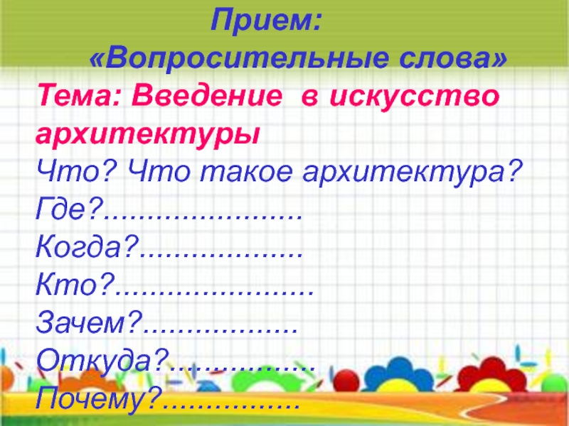 «Вопросительные слова» Тема: Введение в искусство архитектуры Что? Что такое архитектура? Где?....................... Когда?................... Кто?....................... Зачем?.................. Откуда?................. Почему?................
