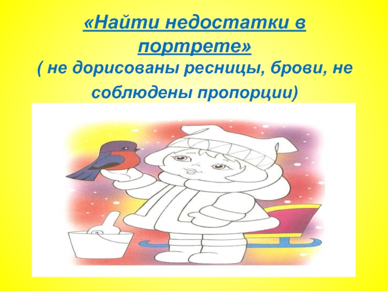 Слайд 23«Найти недостатки в портрете» ( не дорисованы ресницы, брови, не соблюдены