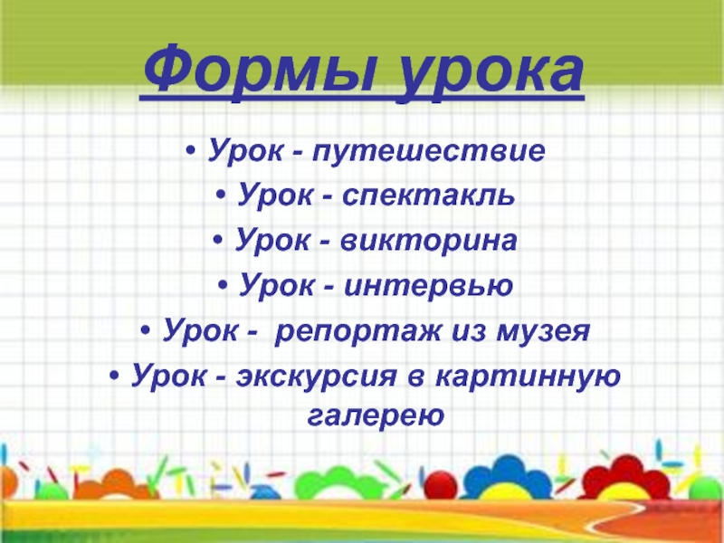 Формы урокаУрок - путешествиеУрок - спектакльУрок - викторинаУрок - интервьюУрок - репортаж из музеяУрок - экскурсия в