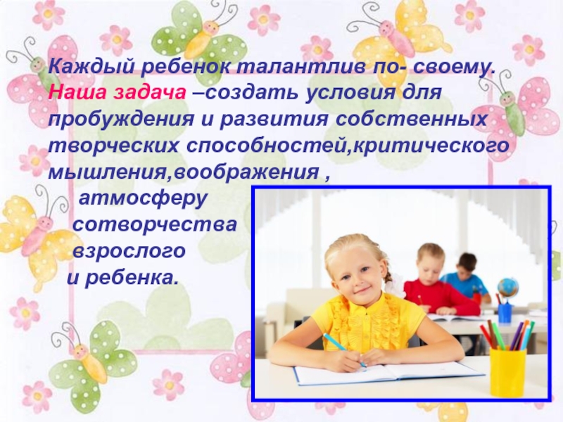 Каждый ребенок талантлив по- своему. Наша задача –создать условия для пробуждения и развития собственных творческих способностей,критического мышления,воображения