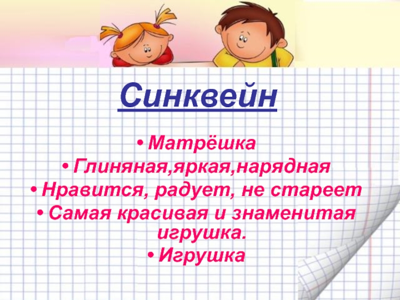 Синквейн МатрёшкаГлиняная,яркая,наряднаяНравится, радует, не стареетСамая красивая и знаменитая игрушка.Игрушка
