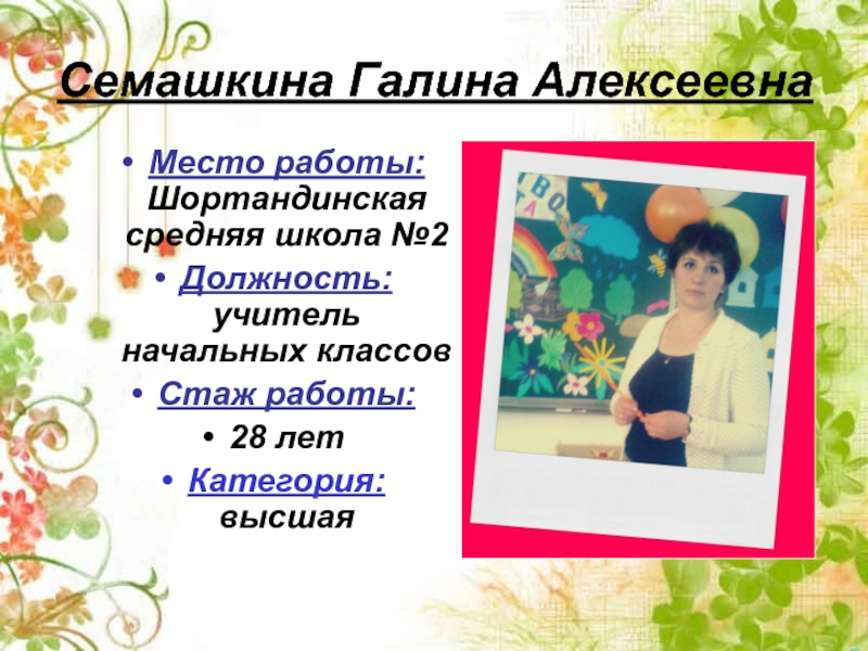 Семашкина Галина АлексеевнаМесто работы: Шортандинская средняя школа №2Должность: учитель начальных классовСтаж работы: 28 летКатегория: высшая