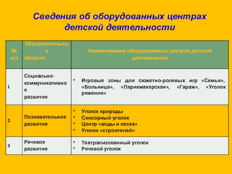 Слайд 33Сведения об оборудованных центрах детской деятельности