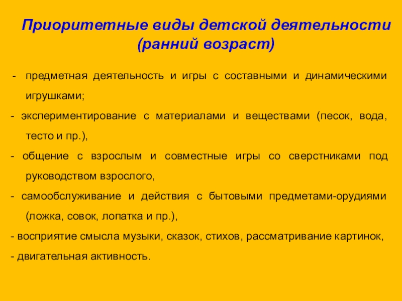 Приоритетные виды детской деятельности (ранний возраст)