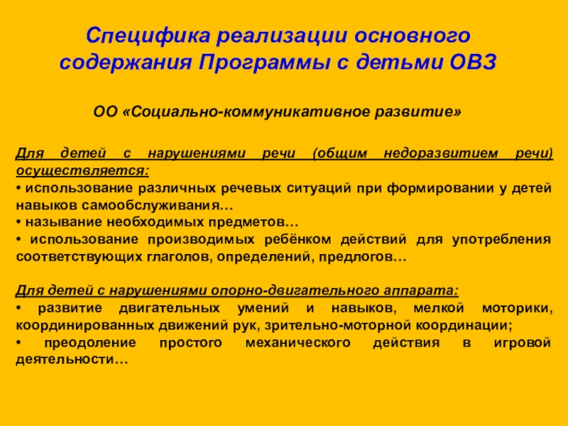 Специфика реализации основного содержания Программы с детьми ОВЗ