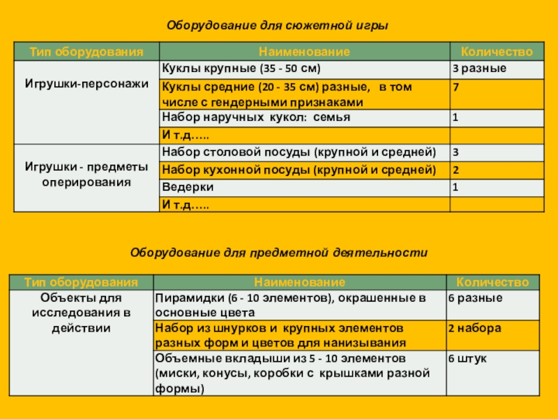 Для социально-коммуникативного развития: игровое оборудование в группе и на участке, включающее предметы оперирования (для сюжетной игры), игрушки (персонажи и маркеры (знаки) игрового пространства).