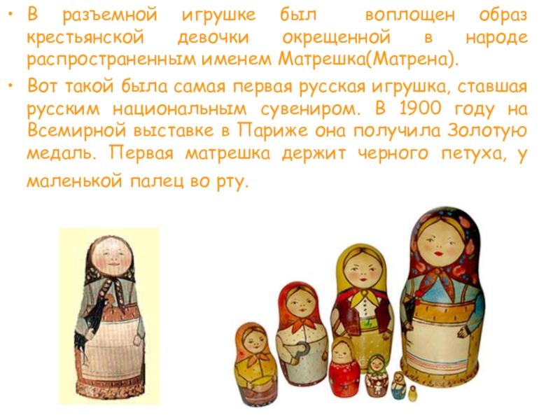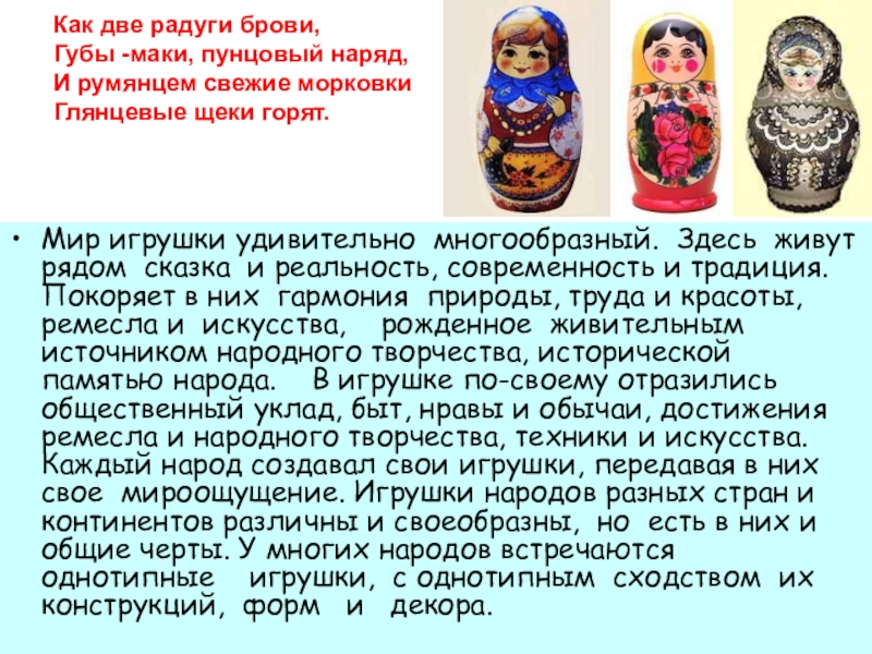 Мир игрушки удивительно многообразный. Здесь живут рядом сказка и реальность, современность и традиция. Покоряет в них гармония природы, труда и красоты, ремесла и искусства, рожденное живительным источником народного творчества, исторической памятью народа. В игрушке по-своему отразились общественный уклад, быт, нравы и обычаи, достижения ремесла и народного творчества, техники и искусства. Каждый народ создавал свои игрушки, передавая в них свое мироощущение. Игрушки народов разных стран и континентов различны и своеобразны, но есть в них и общие черты. У многих народов встречаются однотипные игрушки, с однотипным сходством их конструкций, форм и декора.