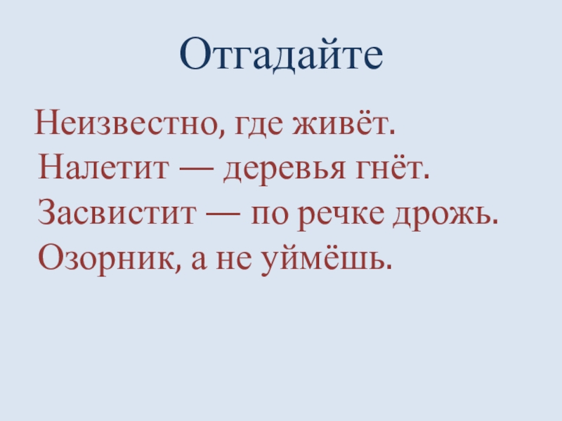 Отгадайте Неизвестно, где живёт.  Налетит — деревья гнёт.  Засвистит — по речке дрожь.  Озорник, а не уймёшь.