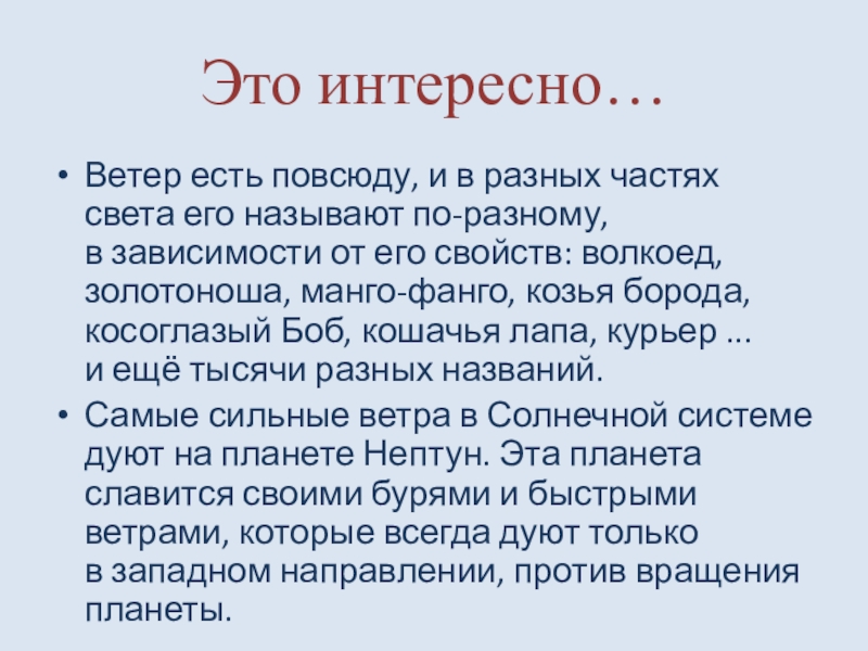 Это интересно…Ветер есть повсюду, и в разных частях света его называют по-разному, в зависимости от его свойств: волкоед, золотоноша, манго-фанго, козья