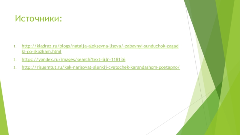 Источники:http://kladraz.ru/blogs/natalja-aleksevna-lisova/-zabavnyi-sunduchok-zagadki-po-skazkam.htmlhttps://yandex.ru/images/search?text=&lr=118136http://risuemtut.ru/kak-narisovat-alenkij-cvetochek-karandashom-poetapno/