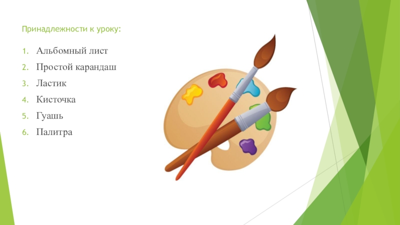 Принадлежности к уроку:Альбомный лист Простой карандашЛастикКисточкаГуашьПалитра