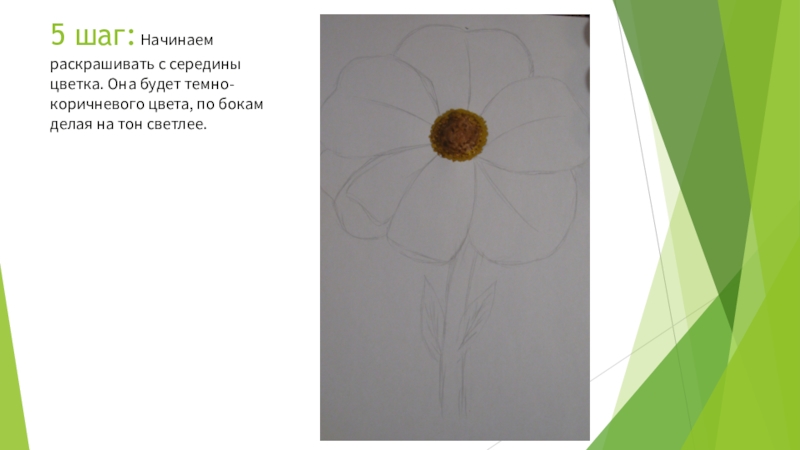 5 шаг: Начинаем раскрашивать с середины цветка. Она будет темно-коричневого цвета, по бокам делая на тон светлее.