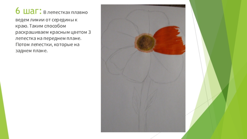 Слайд 96 шаг: В лепестках плавно ведем линии от середины к краю. Таким