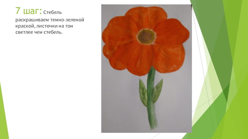 7 шаг: Стебель раскрашиваем темно-зеленой краской, листочки на тон светлее чем стебель.