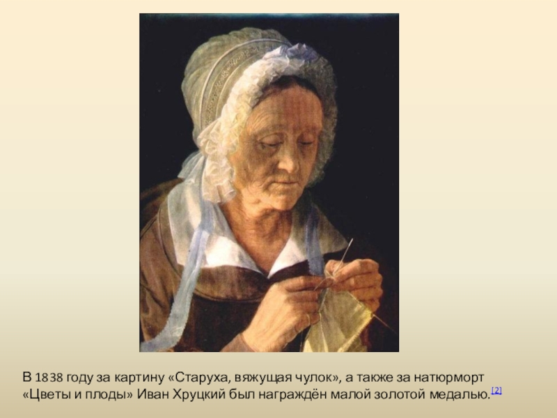 В 1838 году за картину «Старуха, вяжущая чулок», а также за натюрморт «Цветы и плоды» Иван Хруцкий