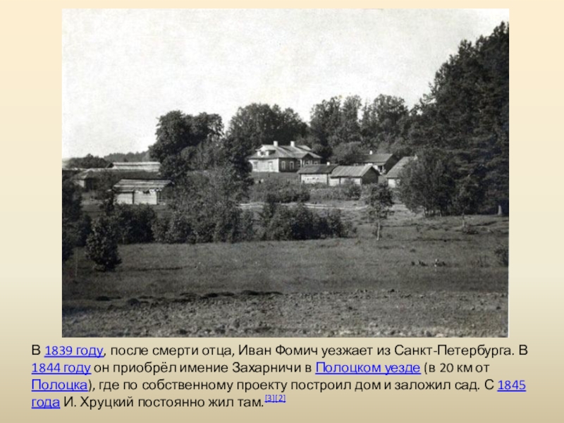 В 1844 году он приобрёл имение Захарничи в Полоцком уезде (в 20 км от Полоцка), где по собственному проекту построил дом и заложил сад. С 1845 года И. Хруцкий постоянно жил там.[3][2]