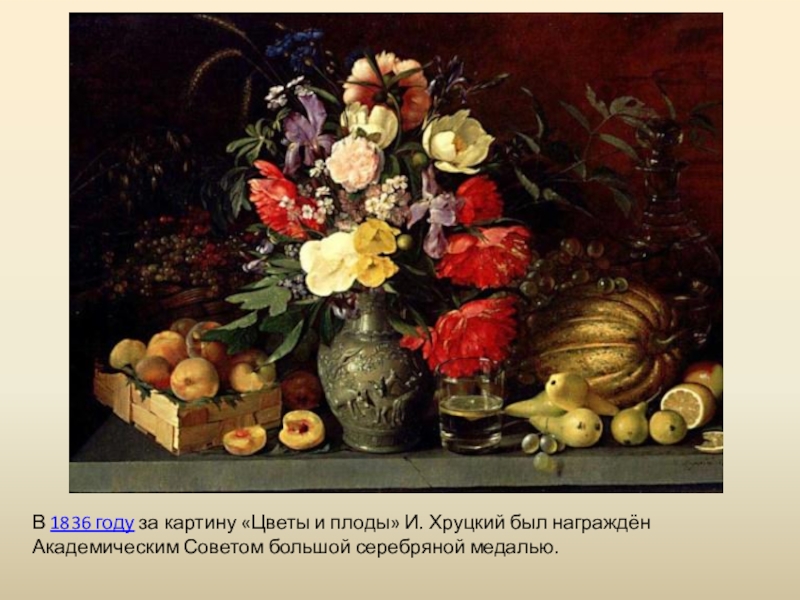Слайд 8В 1836 году за картину «Цветы и плоды» И. Хруцкий был