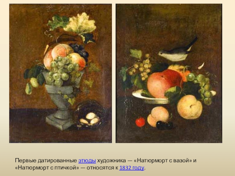 Первые датированные этюды художника — «Натюрморт с вазой» и «Натюрморт с птичкой» — относятся к 1832 году.