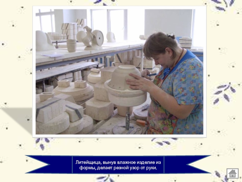Слайд 8Литейщица, вынув влажное изделие из формы, делает резной узор от руки.