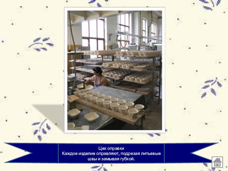 Цех оправки Каждое изделие оправляют, подрезая литьевые швы и замывая губкой.