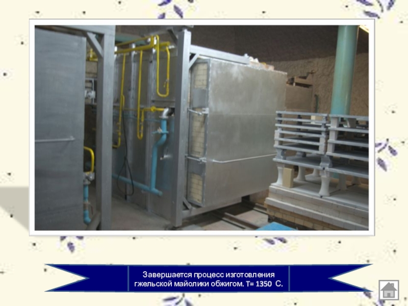 Слайд 14Завершается процесс изготовления гжельской майолики обжигом. T= 1350 С.