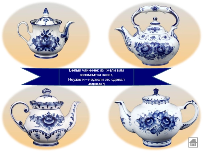 Белый чайничек из Гжели вам запомнится навек.Неужели – неужели это сделал человек?!