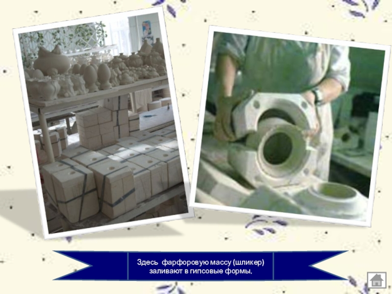 Слайд 7Здесь фарфоровую массу (шликер) заливают в гипсовые формы.