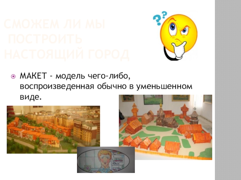 Сможем ли мы  построить  настоящий городМАКЕТ - модель чего-либо, воспроизведенная обычно в уменьшенном виде.