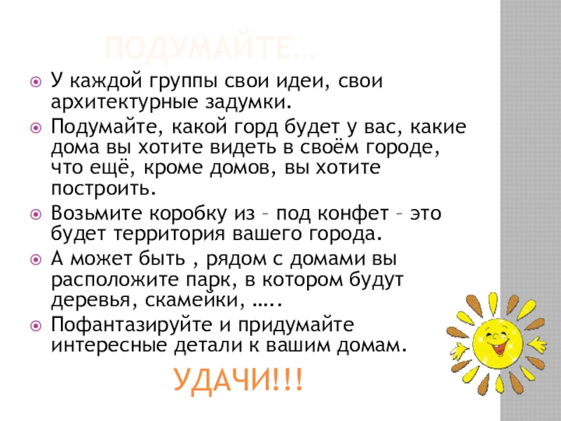 Подумайте…УДАЧИ!!!У каждой группы свои идеи, свои архитектурные задумки.Подумайте, какой горд будет у вас, какие дома вы хотите