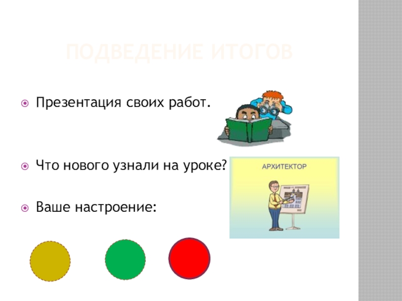 Подведение итоговПрезентация своих работ.Что нового узнали на уроке?Ваше настроение: